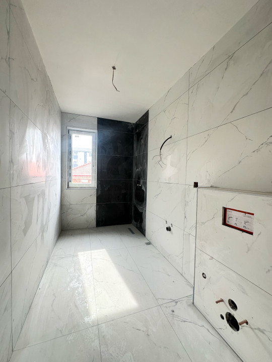 * Baie placată cu gresie și faianță, cu rezervor WC încastrat (pregătit pentru montarea obiectelor sanitare)