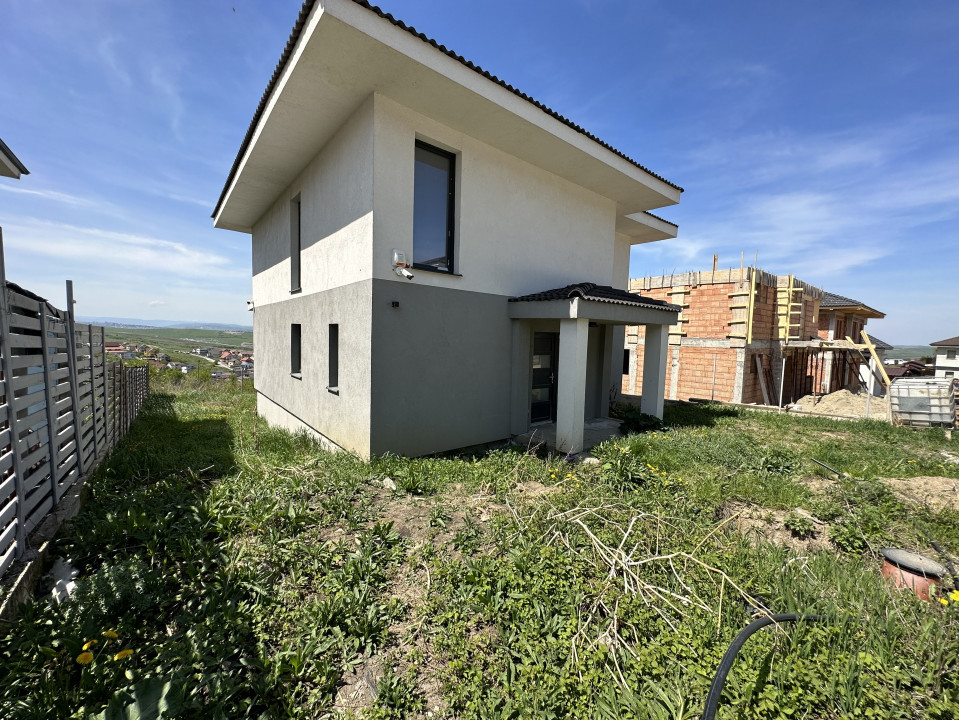 casa dispune de o priveliste deosebita. Dispune de o suprafata utila de 130 mp situat pe o parcela de teren de 415 mp cu front stradal de 17 ml. Este dispusa pe 2 niveluri, P+E+ astfel: Parter: compartimentat un living spatios cu bucatarie, o baie de serviciu, Etaj: compartimentat in 3 dormitoare separate, 2 bai, 1 dresing. Imobilul beneficiaza de centrala termica pe gaz si incalzire cu calorifere, geamuri din termopan cu tamplarie din PVC cu 3 rânduri de sticla. Spatiul locativ este foarte generos iar zona de zi Casa este izolata exterior cu polistiren de 10 cm. Se ofera spre vanzare finisata in proporție aproximativ 70% si instalatiile trase la pozitie.